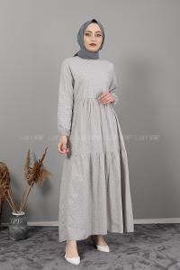 Lamelif Ön Yarım Düğme Detaylı Müslin Kumaş Tesettür Elbise Gri