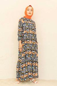 Modalamelif Kol Lastikli Desenli Elbise Oranj