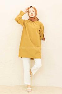 Modalamelif Kol Lastikli Hakim Yaka Tunik Yağ Yeşili