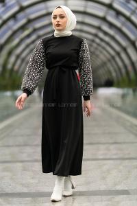 Lamelif Balon Kol Kemerli Tesettür Elbise Siyah