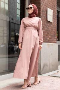 Lamelif Bel Büzgülü Tesettür Elbise Pembe
