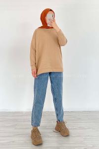 Lamelif Kapşonlu Oversize Yan Cepli Sweat Camel