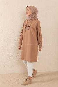 Lamelif Kapşonlu Oversize Yan Cepli Sweat Camel