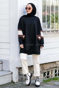 Modalamelif Kolları Renk Garnili Şerit Desenli Sweat Tunik Siyah