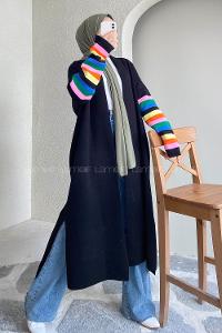 Modalamelif Kolu Çizgi Renk Garnili Yırtmaç Detaylı Hırka Siyah