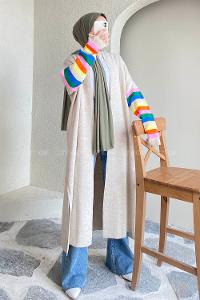 Modalamelif Kolu Çizgi Renk Garnili Yırtmaç Detaylı Hırka Taşrengi