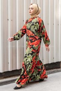 Modalamelif Kolu Lastikli Eteği Fırfırılı Yaprak Desenli Elbise Siyah