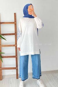 Modalamelif Kolu Nakış İşlemeli Tunik Beyaz