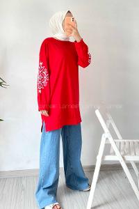 Modalamelif Kolu Nakış İşlemeli Tunik Kırmızı