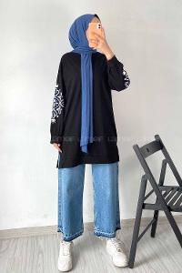 Modalamelif Kolu Nakış İşlemeli Tunik Siyah