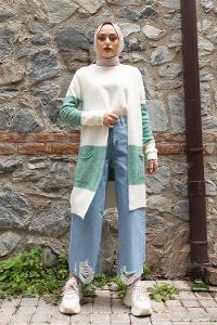 Modalamelif Körük Cep İki Renkli Triko Hırka Ekru Çağla