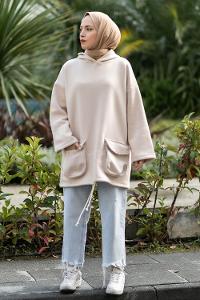 Lamelif Ön Fermuarlı Düz Sweatshirt Bej