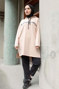 kapüşon yaka, yan yırtmaçlı, ön tarafı yazı baskılı, uzun sweatshırt.