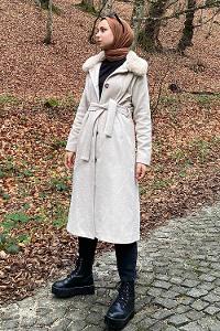 Modalamelif Kürk Detaylı Astarlı Kaşe Kaban Taş Rengi