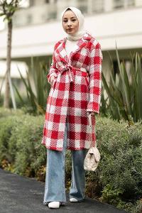 Modalamelif Kuşak Bağlama Detaylı Çift Cepli Kaban Kırmızı