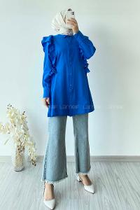 Lamelif Flores Fırfırlı Tunik Saks Mavisi