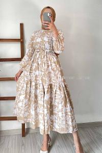 Modalamelif Kuşak Bağlamalı Çiçek Desenli Elbise Bej