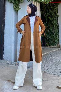 Modalamelif Kuşak Bağlamalı Omuz Apoletli Süet Trenç Kahverengi