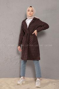 Modalamelif Kuşaklı Ekose Desen Uzun Ceket Kiremit