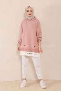 Lamelif Kapşonlu Oversize Yan Cepli Sweat Pudra