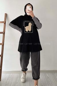 Lamelif Dilvin 30312 Dekoratif Dikişli Bisiklet Yaka Tshirt-Siyah