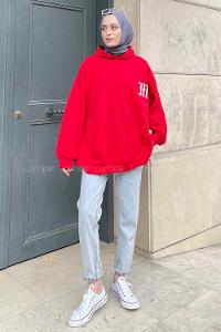 Lamelif Balon Kol Yaka Ve Etek Ucu Manşetli Bol Sweat Kırmızı