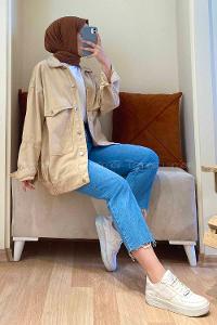 Modalamelif Metal Düğmeli Bel Lastikli Ceket Bej