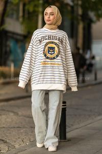 Lamelif Kolu Çizgi Detaylı Kapüşonlu Sweat Ekru