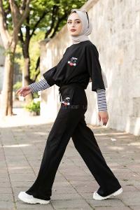 Lamelif Tabata Fitilli Tesettür Takım Siyah