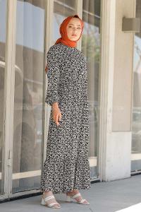 Modalamelif Minimal Çiçek Desen Elbise Siyah