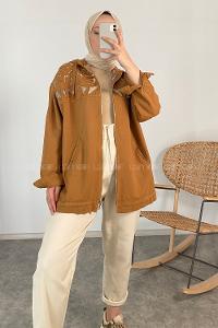Modalamelif Nakış Detaylı Kapşonlu Gabardin Ceket Camel
