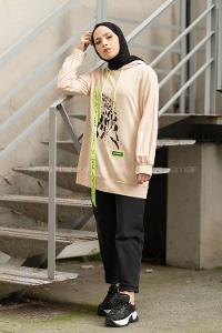 Modalamelif Neon Şeritli Baskılı Sweatshirt Bej
