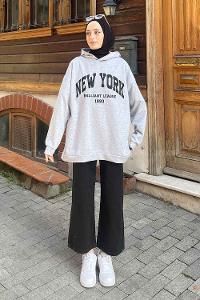 Lamelif Newyork Baskı Detaylı Kapüşonlu Sweatshirt Gri