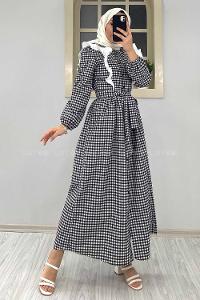Modalamelif Omuz Fırfırlı Ekose Elbise Siyah
