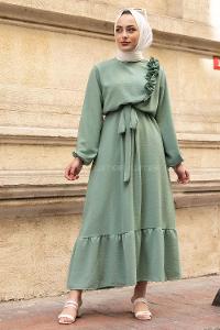Lamelif Taş Detaylı Tesettür Elbise Haki