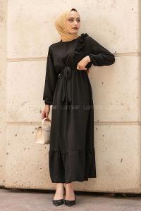Lamelif Bel Büzgülü Tesettür Elbise Siyah