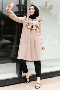 Modalamelif Omuz Fırfırlı Nakış Detaylı Tunik Vizonrengi