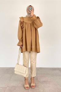 Lamelif Bisiklet Yaka Omuz Fırfırlı Tunik Bej