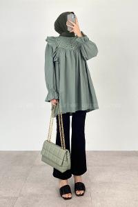 Omuz ve Göğüs Kısmı Fırfırlı Yarım Düğmeli Şık Tunik Çağla Yeşili