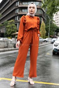 Modalamelif Omuz Fırfırlı Yarım Düğmeli Tulum Elbise Taba Rengi