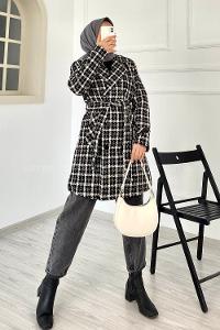 Modalamelif Ön Düğmeli Astarlı Çift Cepli Kuşak Bağlamalı Ekose Kaban Siyah