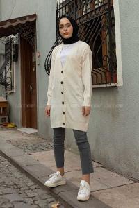 Modalamelif Ön Düğmeli İnce Fitilli Triko Hırka Ekru