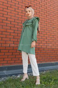 Omuz ve Göğüs Kısmı Fırfırlı Yarım Düğmeli Şık Tunik Çağla Yeşili