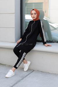 Modalamelif Ön Fermuarlı Şeritli İkili Takım Siyah