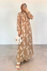 Lamelif Desenli Volanlı Tesettür Elbise Acı Kahve