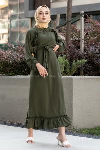 Modalamelif Ön ve Etek Fırfır Detaylı Kuşaklı Ayrobin Elbise Haki