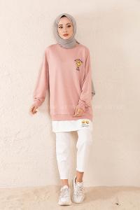 Modalamelif Önü Baskılı Etek Garnili Sweatshirt Pudra