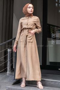 Modalamelif Önü Boy Düğmeli Beli Kuşaklı Elbise Camel
