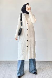 Modalamelif Önü Boydan Düğme Detaylı Fitilli Uzun Hırka Ekru