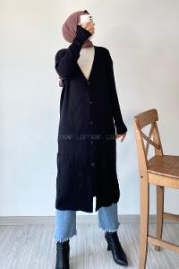 Modalamelif Önü Boydan Düğme Detaylı Fitilli Uzun Hırka Siyah